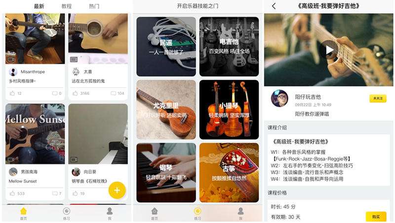 1.乐器教学:用户可以通过应用在线学习乐器。教学方法可以用图片或视频教学来说明。